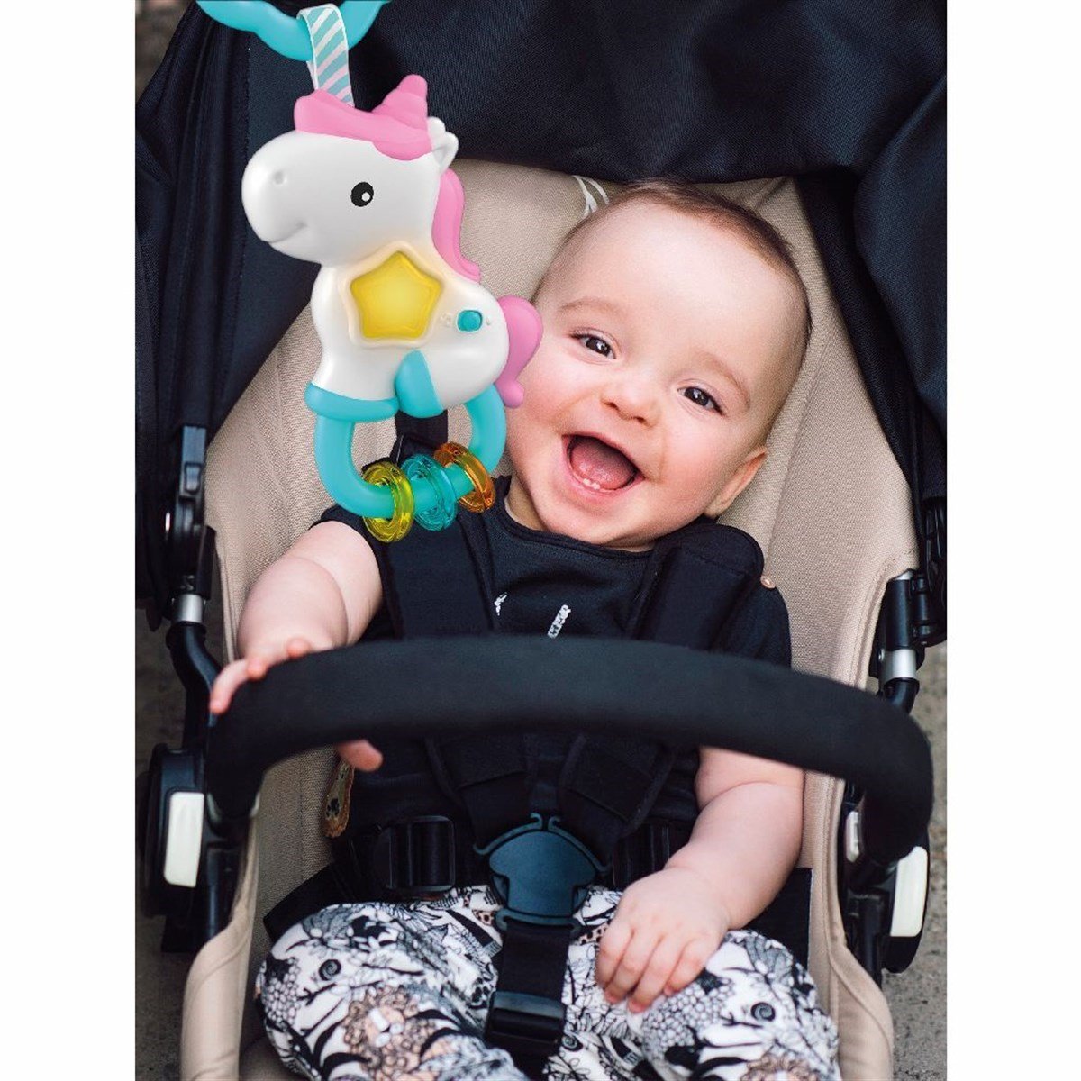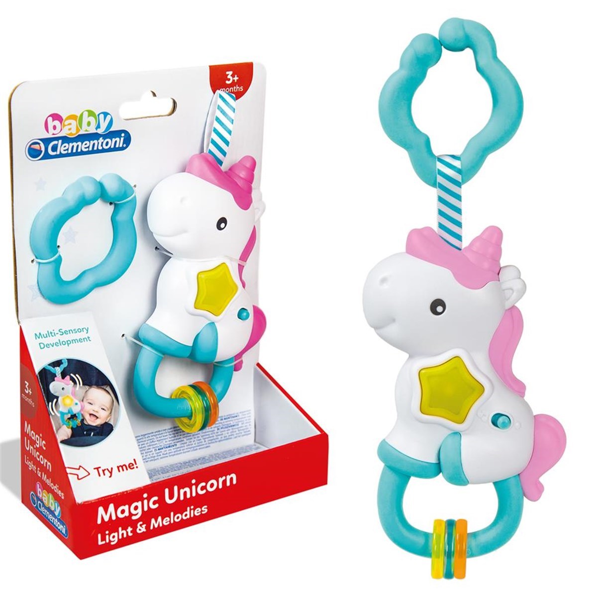 Bebeğinizi ışıklar ve müzikle eğlendiren sihirli tek boynuzlu at! Aydınlanan yıldız şeklinde düğme ve eğlendirici ses sesler üreten renkli sallanan halkalar içerir. Pratik halka çıngırağı beşiğe veya bebek arabasına asıp her yere götürmek için tasarlanmıştır.