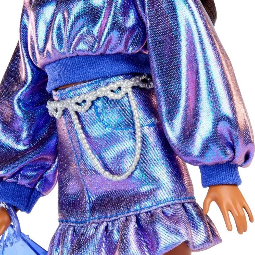 Parıltılı ve trend kıyafetiyle bu Barbie bebek her duruma hazır! Buz mavisi kısa bir üst ve fırfırlı bir etek giyiyor, hepsi ultra şık metalik bir tarzda. Kahverengi saçları topuz yapılmış ve yanında çeşitli moda aksesuarları var: küpeler, kolye, kalp şeklinde kemer, süslü el çantası ve güneş gözlüğü. Ayrıca gümüş rengi botlar giyiyor. Eklemleri sayesinde farklı pozlar alabilir. Modayı ve yaratıcı hikayeleri seven 4 yaş ve üzeri çocuklar için idealdir.