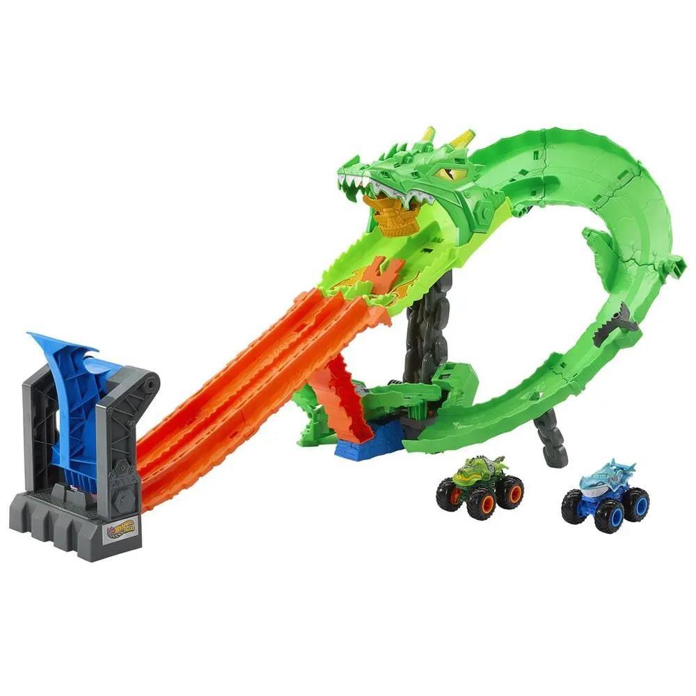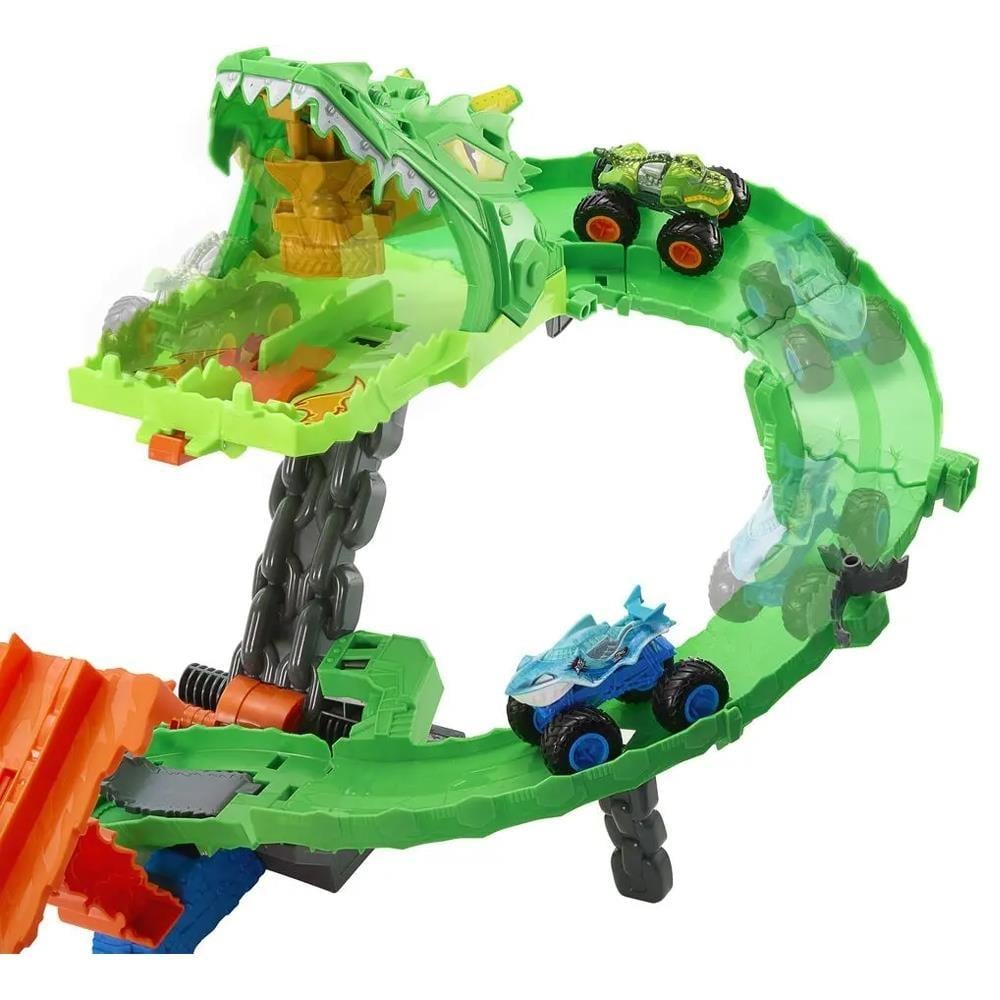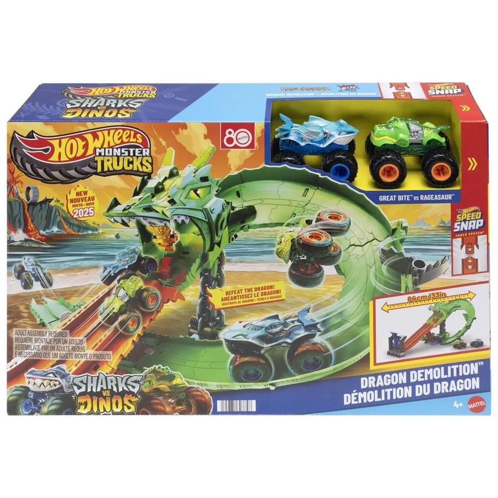 Hot Wheels Monster Trucks Great Bite ve Rageasaur, Köpekbalıkları ve Dinozorlar Ejderha Yıkım Oyun Seti'nde ezeli düşman ejderhayı yenmek için yarışıyor. Birlikte verilen oyuncak kamyonları çift fırlatıcıya yükleyin, ardından onları yan yana siborg ejderhanın ağzından geçirin. Ejderhanın içinden aşağıya doğru yarışırlar ve burada bir motorlu testere yönlendirici rastgele üç sonuçtan birini seçer: her iki kamyonu da tutmak, bir kamyonu pistten düşürmek veya her ikisinin de kaçarak ezeli düşmanı yenmesini sağlamak. Boyutu : 11.0 x 51.0 x 33.0 cm