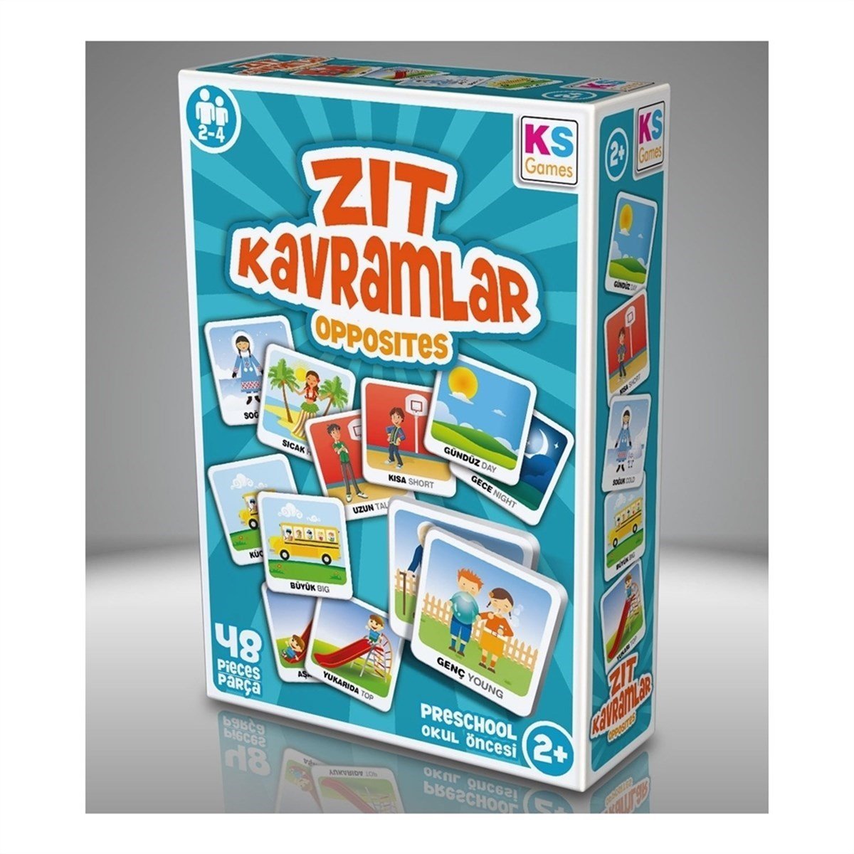 Kart oyununda 24 ayrı zıt kavramı temsil eden 48 adet kart bulunmaktadır. Oyunda soğuk-sıcak, uzun-kısa gibi kavram çiftlerinin yanı sıra içinde-dışında, aşağıda-yukarıda gibi edat belirten zıtlıklara da yer verilmiştir. Tüm kartlar karıştırılarak resimli yüzeyleri yukarı bakacak ve 6x8 kartlık bir dikdörtgen oluşturacak şekilde düz bir zemine dizilir. Çocuğa bir kavram kartı gösterilir ve ondan zıttını bulması istenir. Bulunan zıt kavram çifti oyundan çıkarılır ve bu şekilde tüm zıt kavramlar tükenene kadar oyun devam eder. Kavramların tam anlaşılması ve pekiştirilmesi için her bir zıt kavram kartı bulunduktan sonra çocuğun çevresindeki objeler vasıtasıyla aynı zıt kavram çiftini göstermesini istemek son derece faydalı olacaktır. Zıt kavramlar kart oyunu okul öncesindeki çocuğunuzun eğlenceli bir oyun ortamında kavramsal algılama ve dil becerilerini geliştirmesine yardımcı olacaktır. 2-4 kişi ile oynanır. 48 parça içerir. 2 yaş ve üzeri için uygundur.
